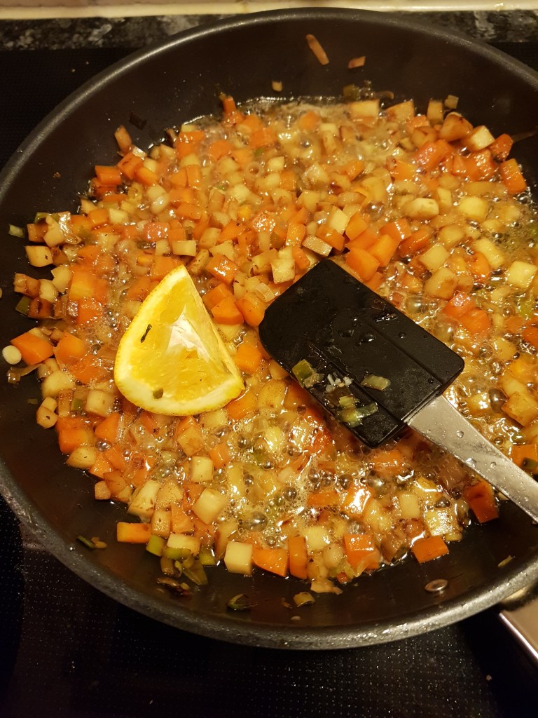 Tilsatte så hvitvinen og lot væsken dampe nesten helt inn før smørterningene ble tilsatt og rørt inn slik at grønnsakene fikk en kremet konsistens. Krydret med salt og sitronsaft.