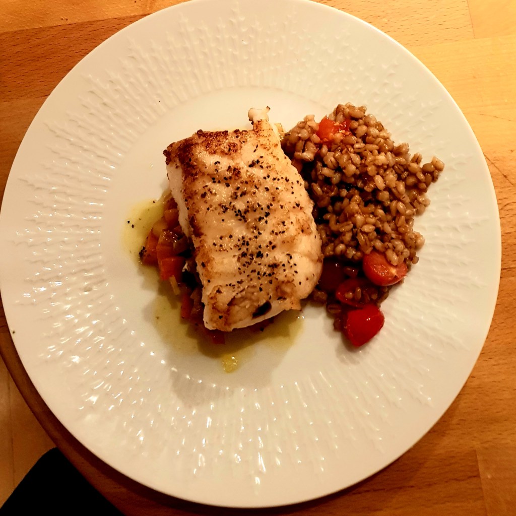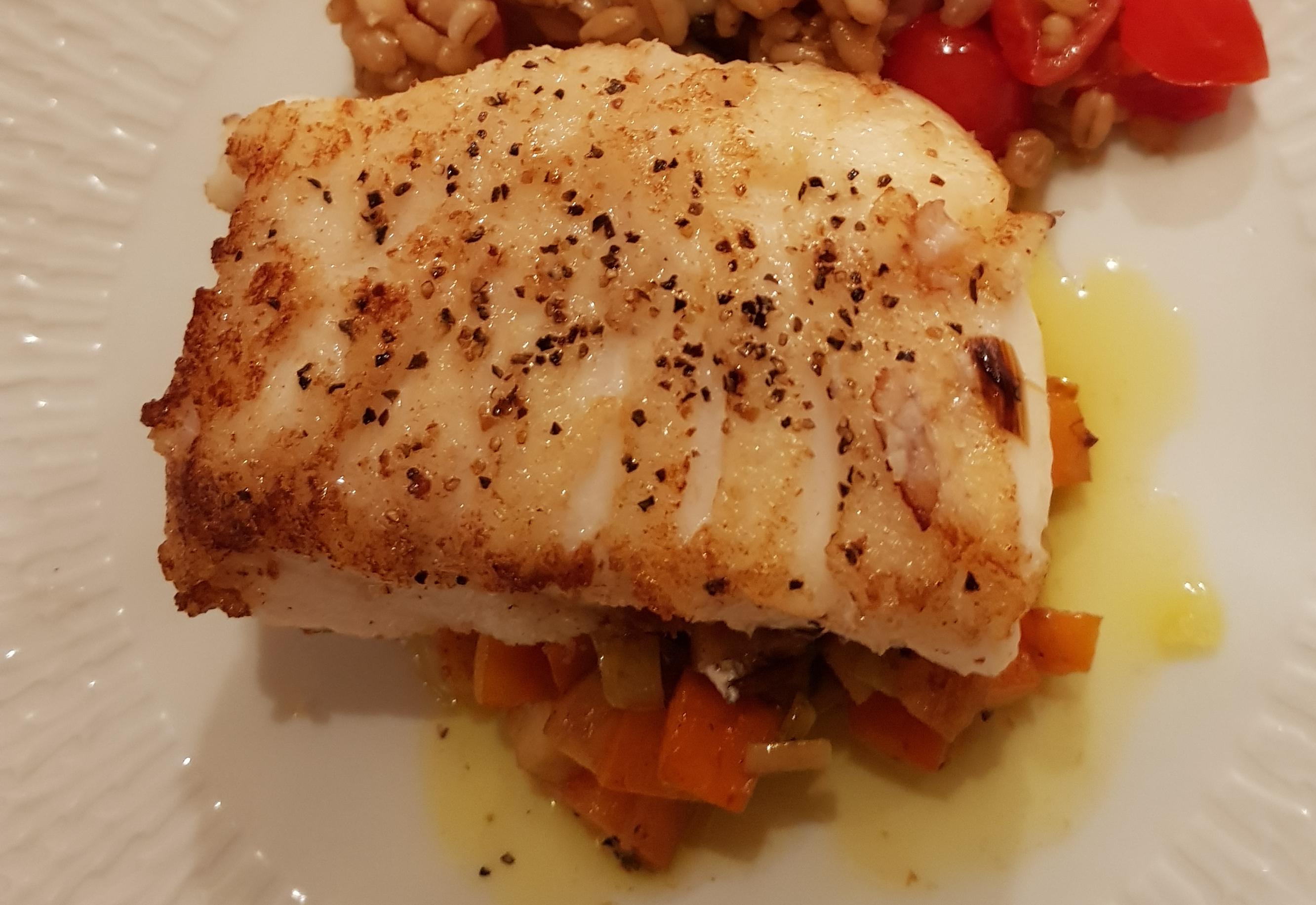Serverte den stekte fisken oppå en seng av grønnsakene. Som tilbehør ble det stekte kokte middagsbygg denne gangen. Du kan koke middagsbygg og fryse ned i porsjonspakker- lettvint og sunt da den inneholder mye protein og fiber.