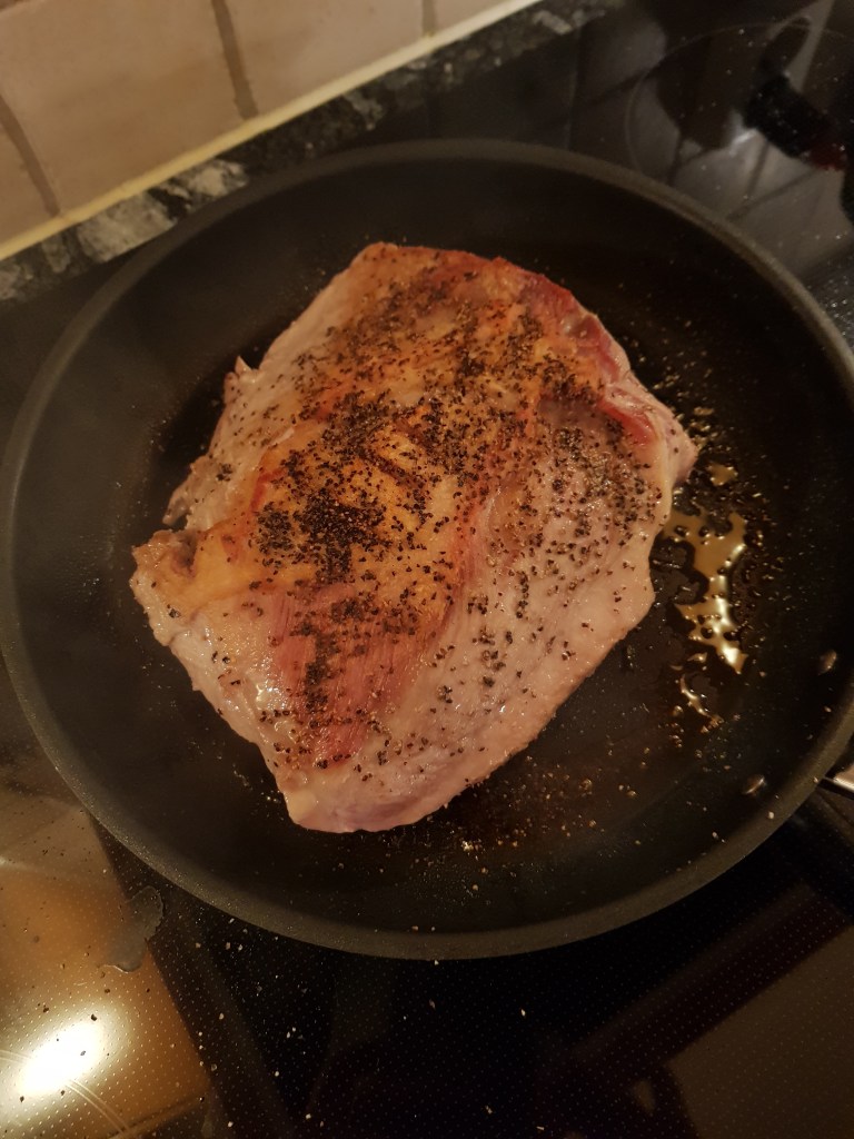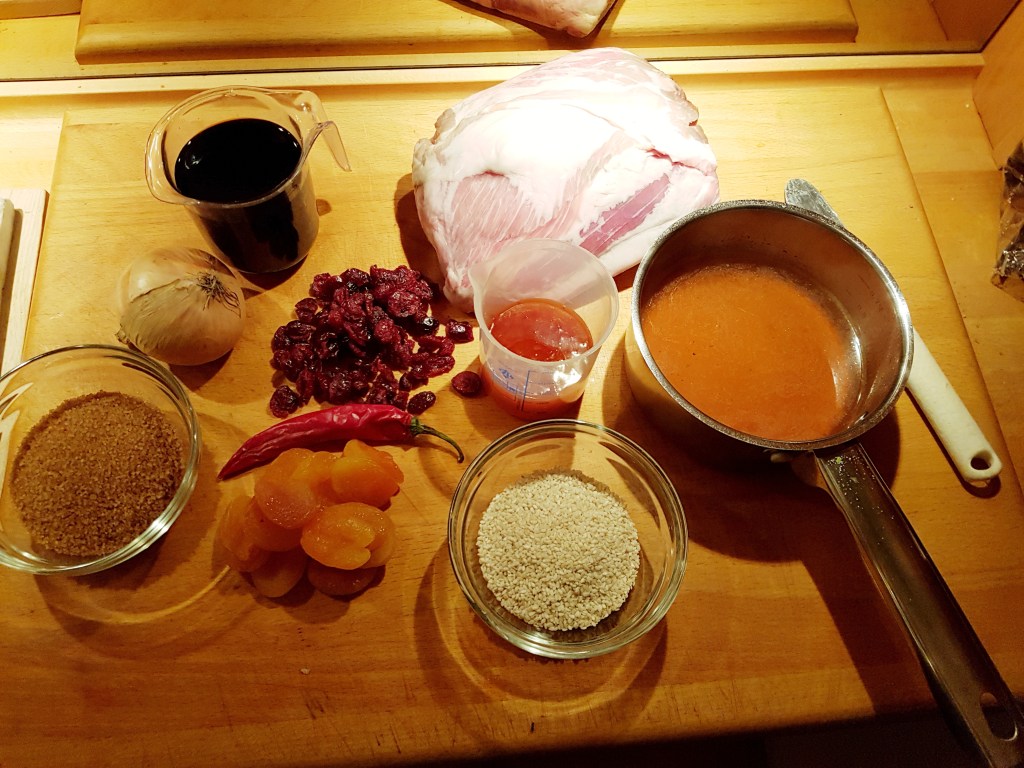 Svinenakken ble krydret med salt og grov pepper-over det hele. Den ble brunet i rapsolje og lagt i en ovnsfast form. I samme pannen ble løken stekt litt til den ble blank. Tilsatte så resten av ingrediensene, alt fikk et oppkok og ble deretter helt over svinenakken som fikk stukket i seg et steketermometer i den tjukkeste delen..