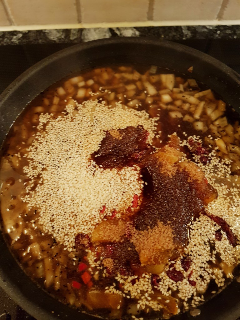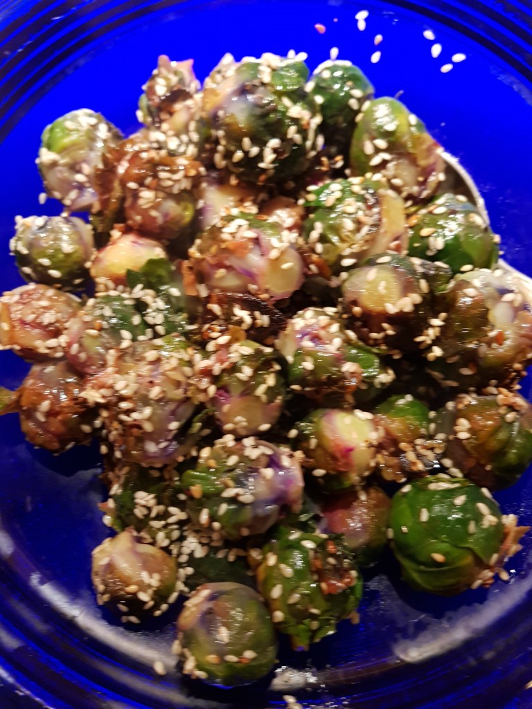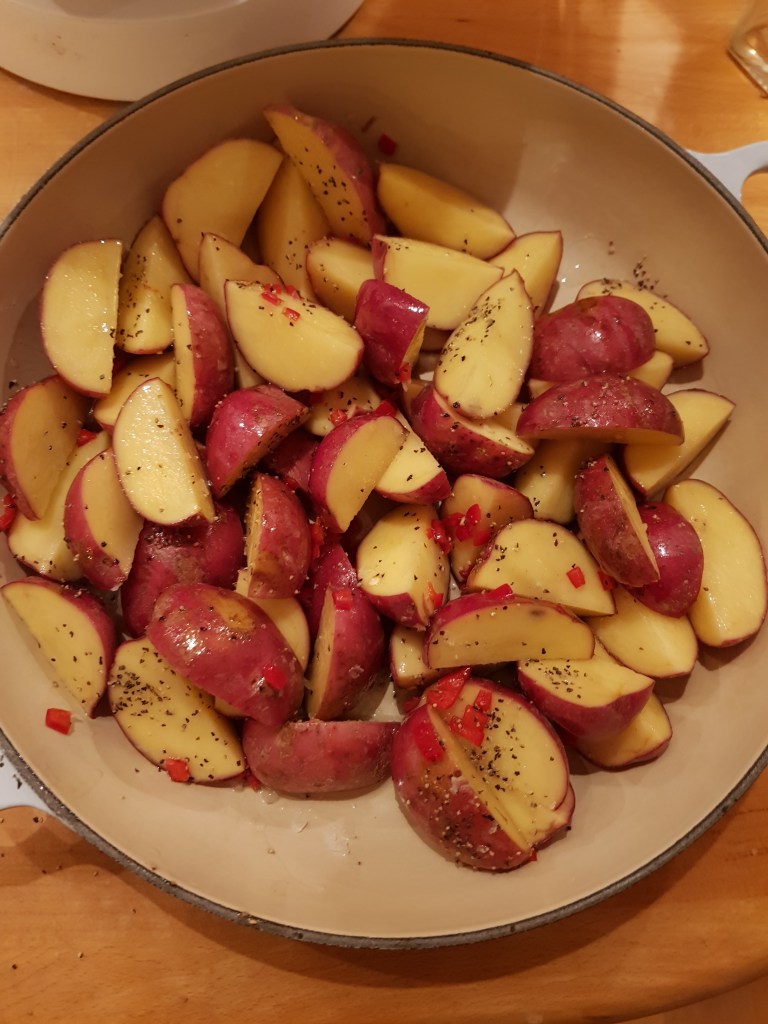 Til kjøttet serverte jeg kokte rosenkål som ble stekt i smør sammen med sesamfrø og limesaft og potetbåter som ble ovnsbakte sammen med olje, salt, pepper og hakket rød chili. Potetene fikk rørt inn hakket koriander like før servering.