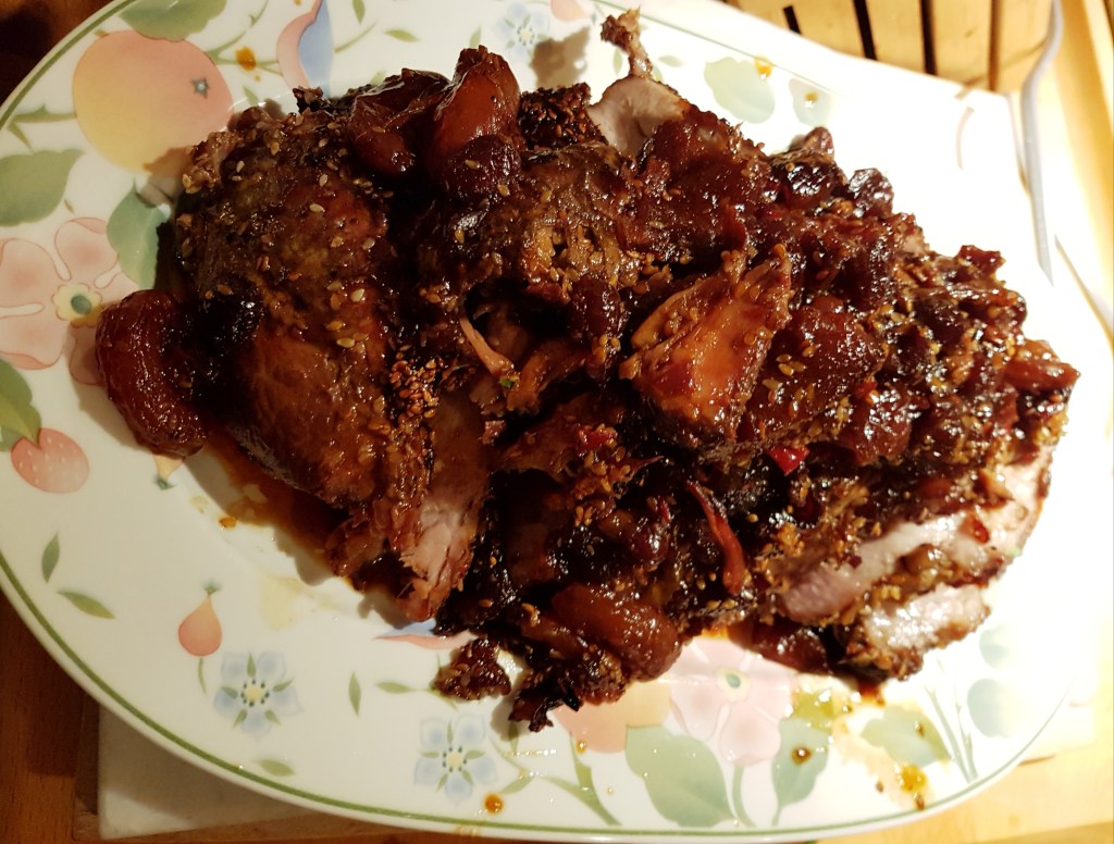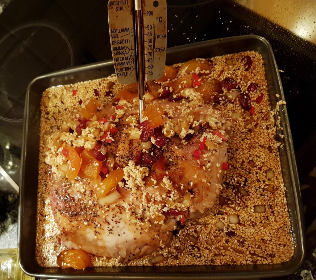 Luktene fra ovnen var utrolige- det skerpet appetitten veldig- kjøkkenet var fylt av de deiligste aromaene. Kjøttet fikk hvile litt før jeg skar det opp i skiver- det var så mørt at det ble bare en haug med ødelagte kjøttbiter- det gjorde ingenting. Øste de tørkede fruktene og sky over ved servering