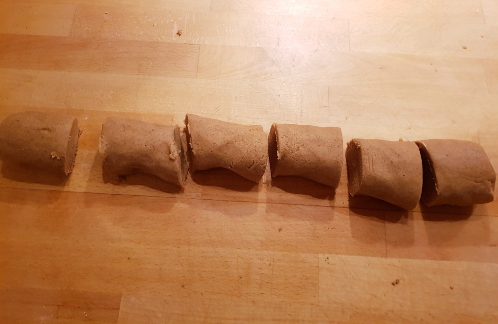 Delte deigen i 6 omtrent like store deler som ble rullet til pølser som passet på et stekebrett.