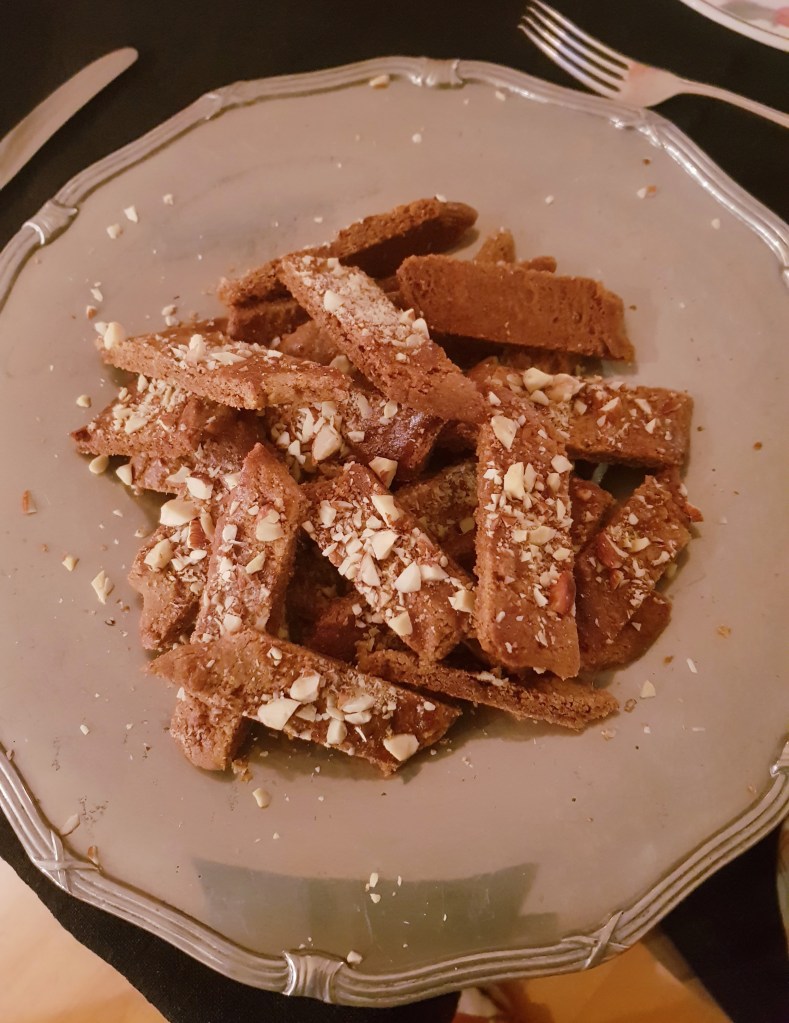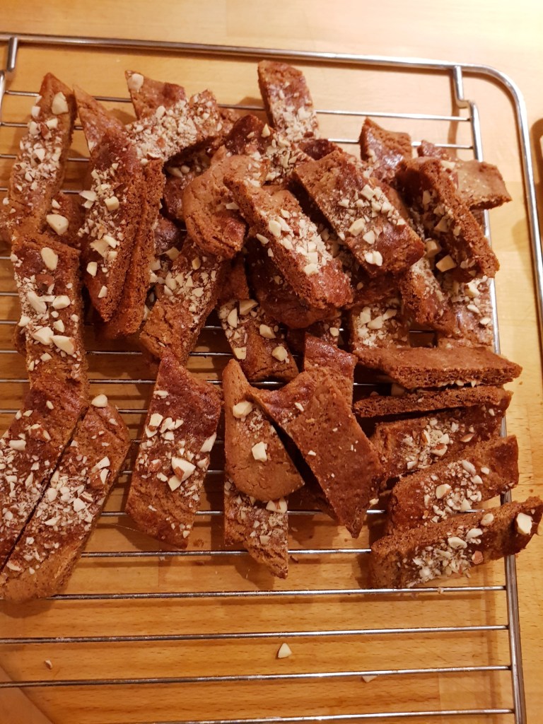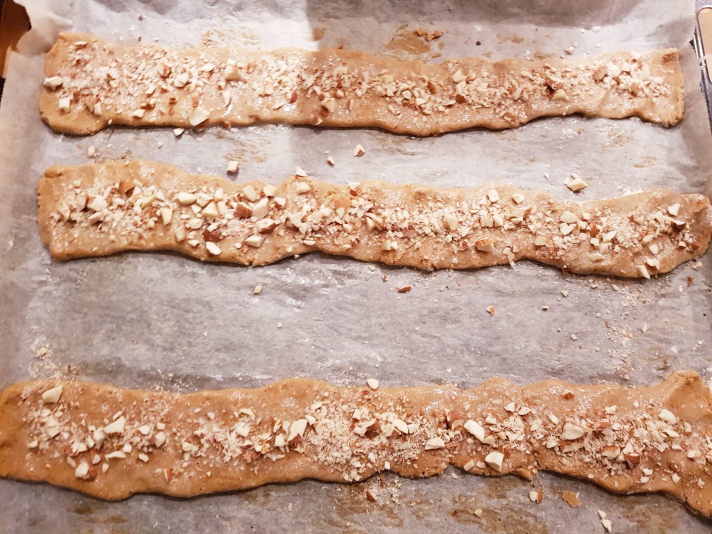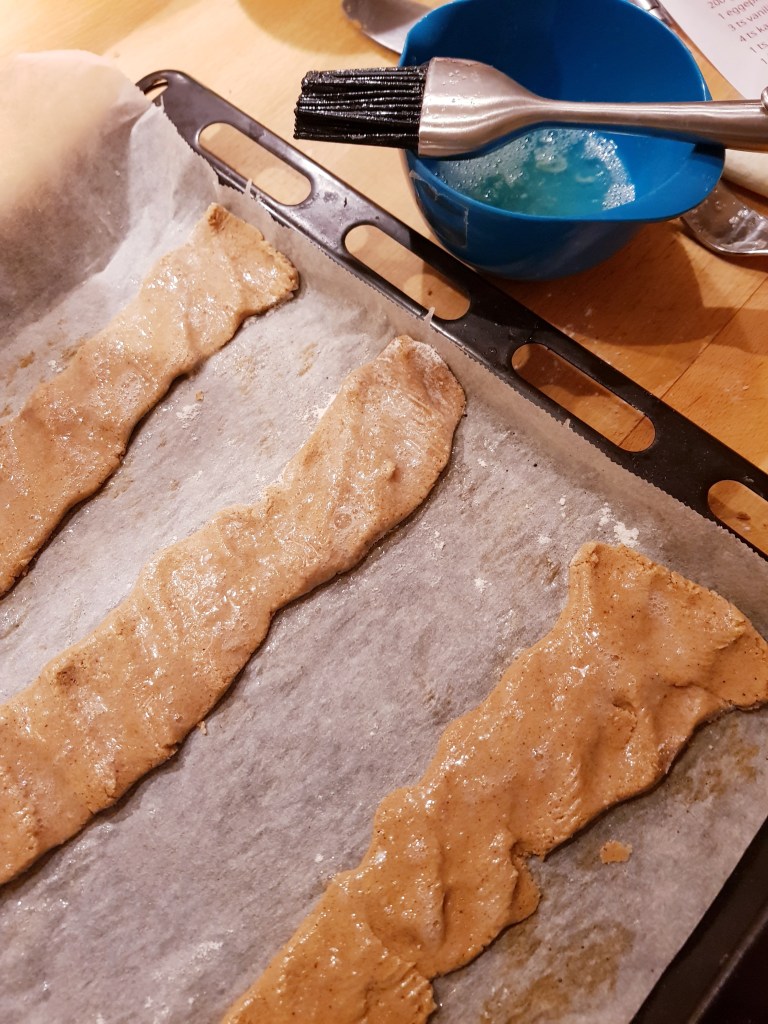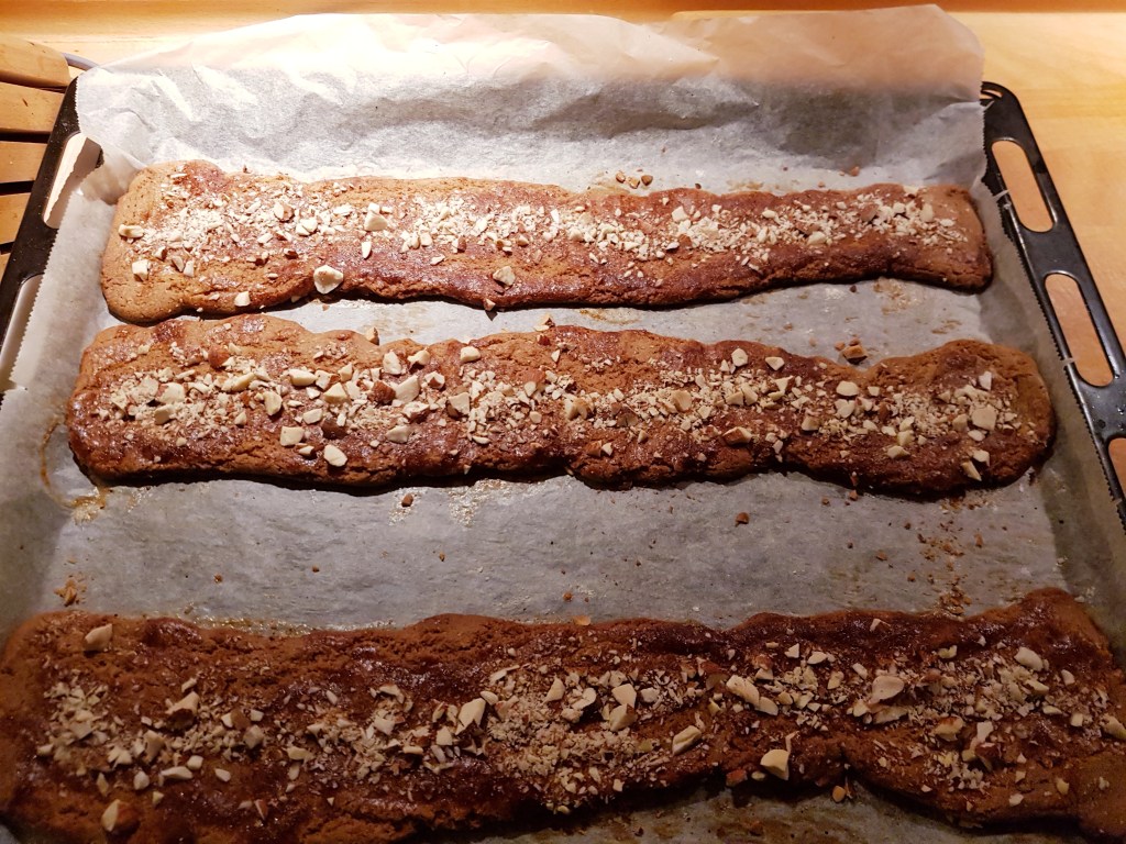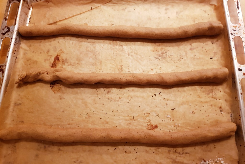 Stengene ble stekt ved 180 grader i 12-13 minutter. De flyter litt utover når de kommer i varm ovn. Etter litt avkjøling (de er veldig myke når de er varme) ble stengene skåret i biter med en skarp kniv- skjær litt på skrå. De ble deretter avkjølt helt på rist