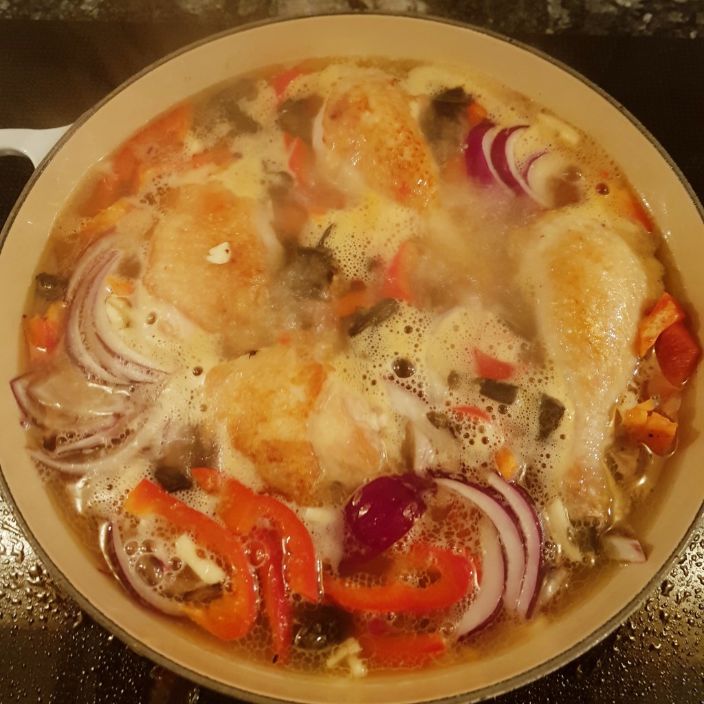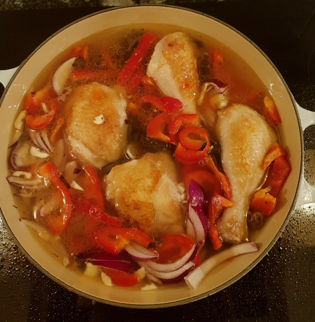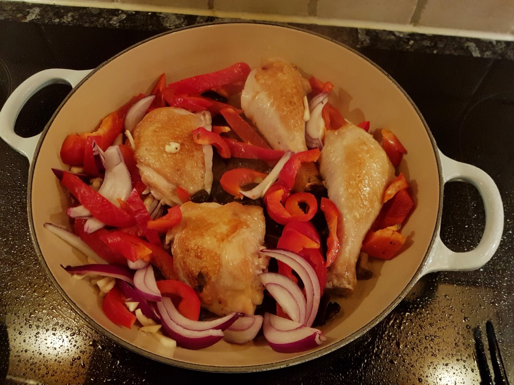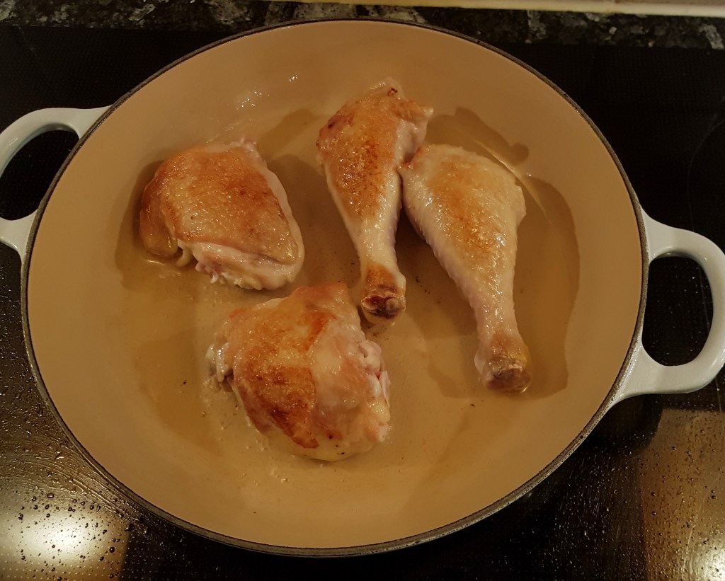 Kyllingen ble brunet godt i rapsolje i en panne med litt høye kanter.
