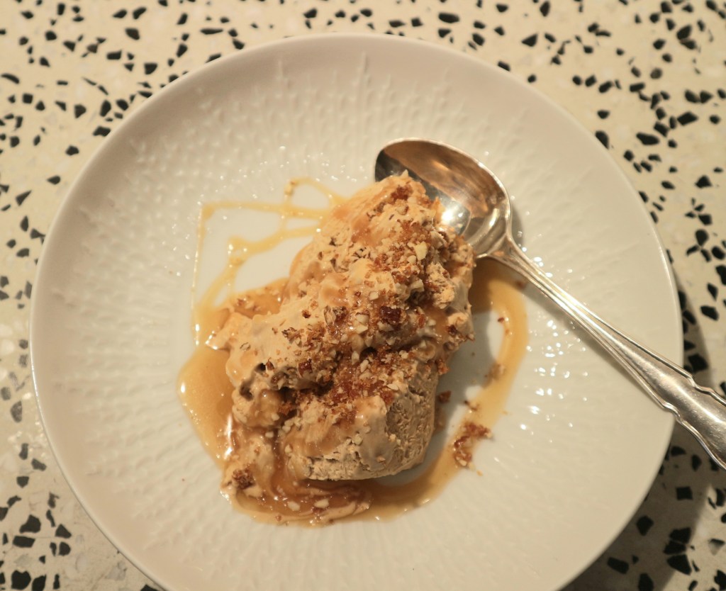 Isen har en herlig smak av espressokaffe og her serverte jeg den med salt karamellsaus og smuler av karamelliserte mandler – tipper det er godt med sjokoladesaus hvis du er fan av det.