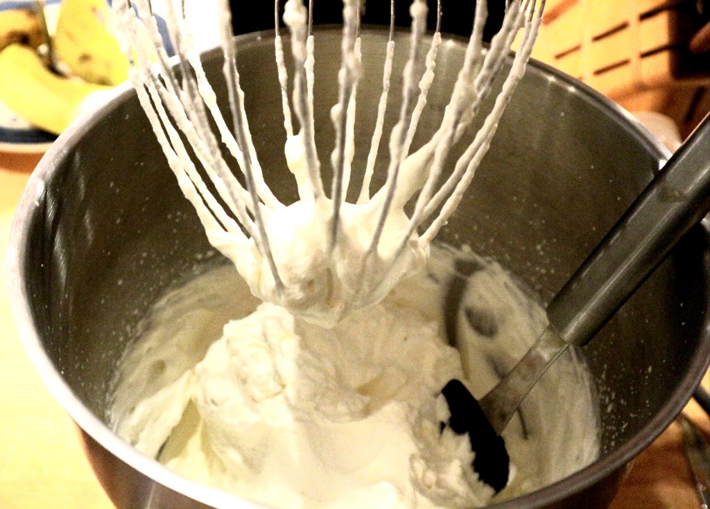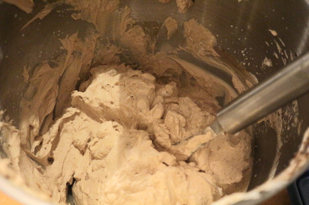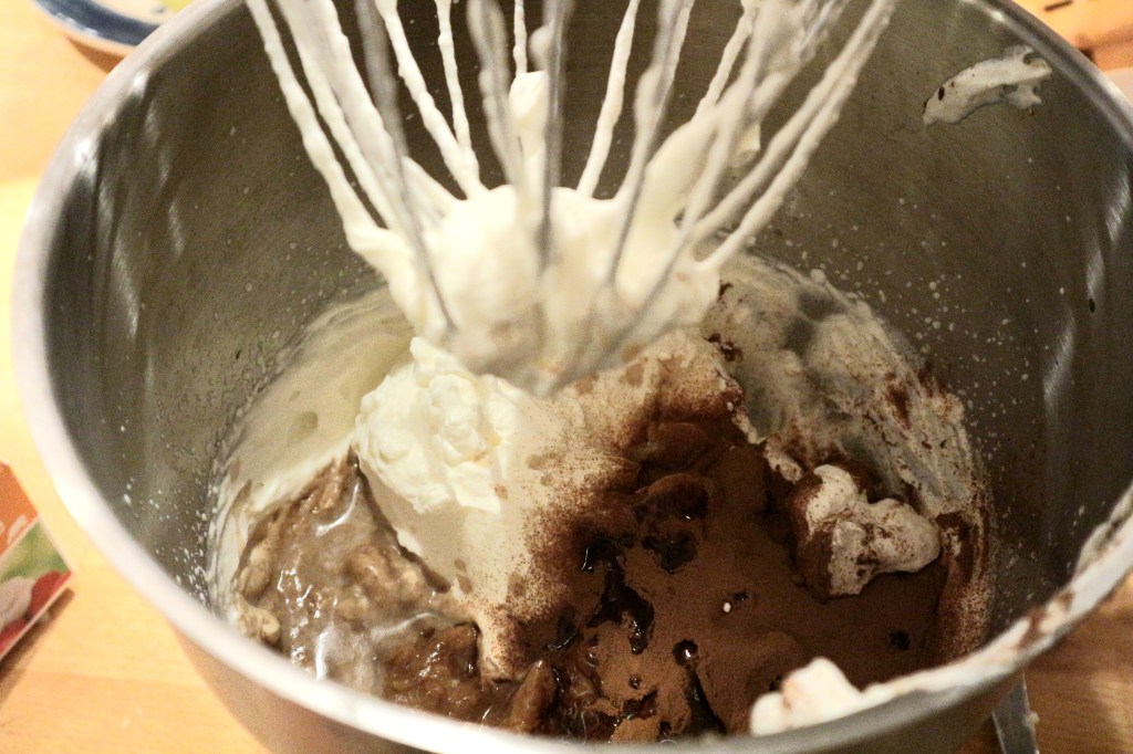 6 dl fløte ble pisket til ikke altfor stiv krem. Deretter tilsatte jeg 1 boks dulce de leche (fåes kjøpt bl.a. på MENY), 4 spiseskjeer espressopulver og 4 spiseskjeer likør og pisket videre til blandingen var tykk.