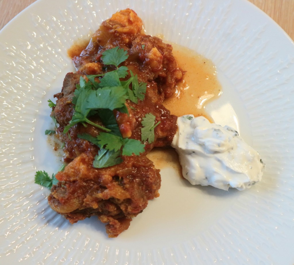 Dryss over hakket koriander og server med gresk youghurt med mynteblader og brød, flatbrød, ris, couscous osv.