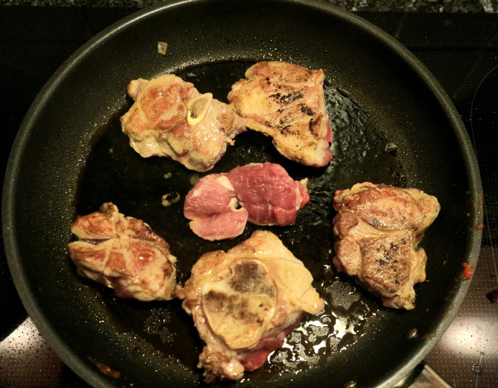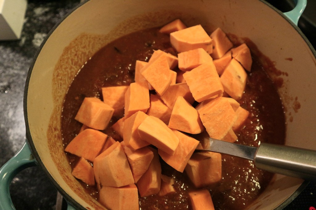 Brun kjøttstykkene på en varm panne i litt rapsolje og tilsett dem til gryten sammen med søtpotetene.