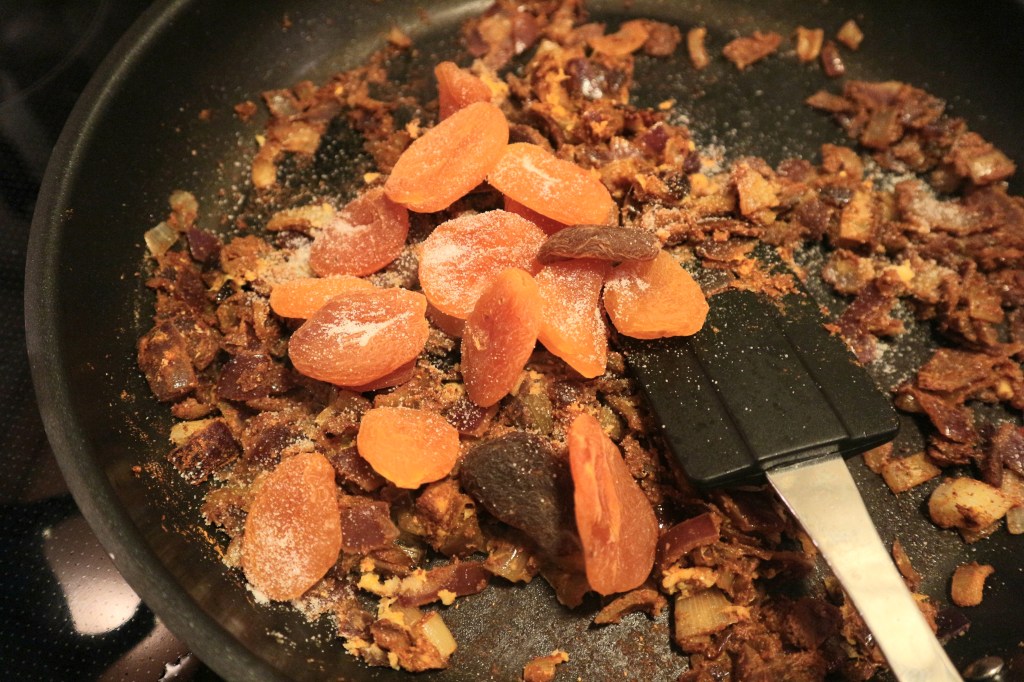 Tilsett så den revne ingefæren og hvitløken. Rør godt og stek videre i 1-2 minutter. Tilsett så aprikosene, tomatene og litt vann.