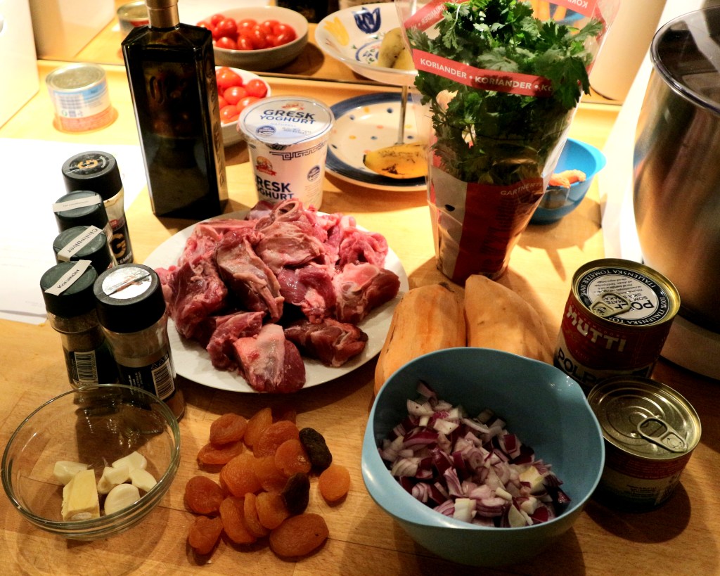 Nok en lammegryte med marokkanske smaker. Det herlige med slike gryter er at du kan lage dem ferdig i god tid før du skal servere dem- de blir bare enda bedre av å nedkjøles og oppvarmes igjen. Denne gangen har jeg brukt lammebog i stykker og beholdt beina fordi det gir en så fantastisk god smak.