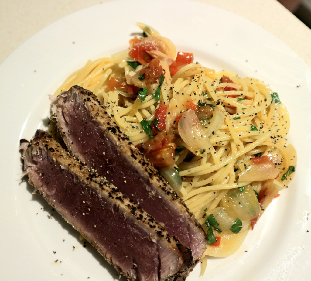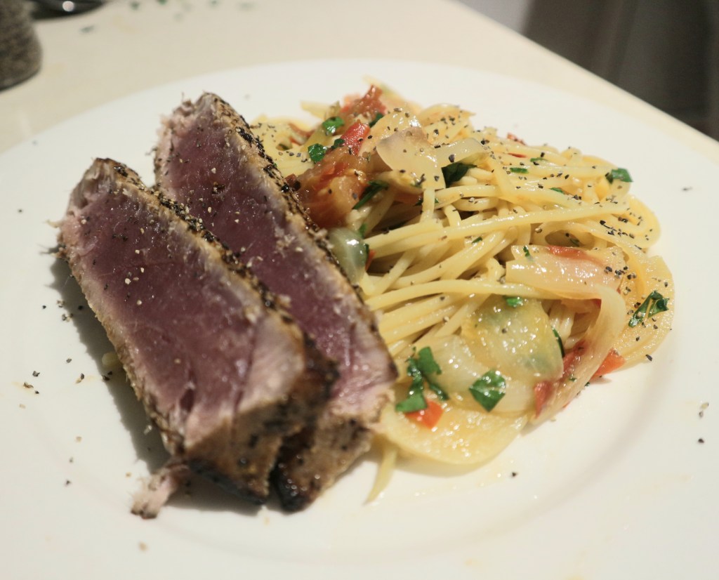 Fisken ble stekt i en blanding av smør og olje på høy varme på alle overflater. Den skal være rå inni og bare ha en grå kant rundt det hele. La den hvile noen minutter på benken. Ved servering ble tunfisken skåret i skiver og lagt ved pastaen direkte på tallerkenen. Det er restene av marinaden og sødmen fra løken som gjør at denne sausen blir så veldig god- og, en frisk, tørr kald hvitvin forringer slett ikke opplevelsen