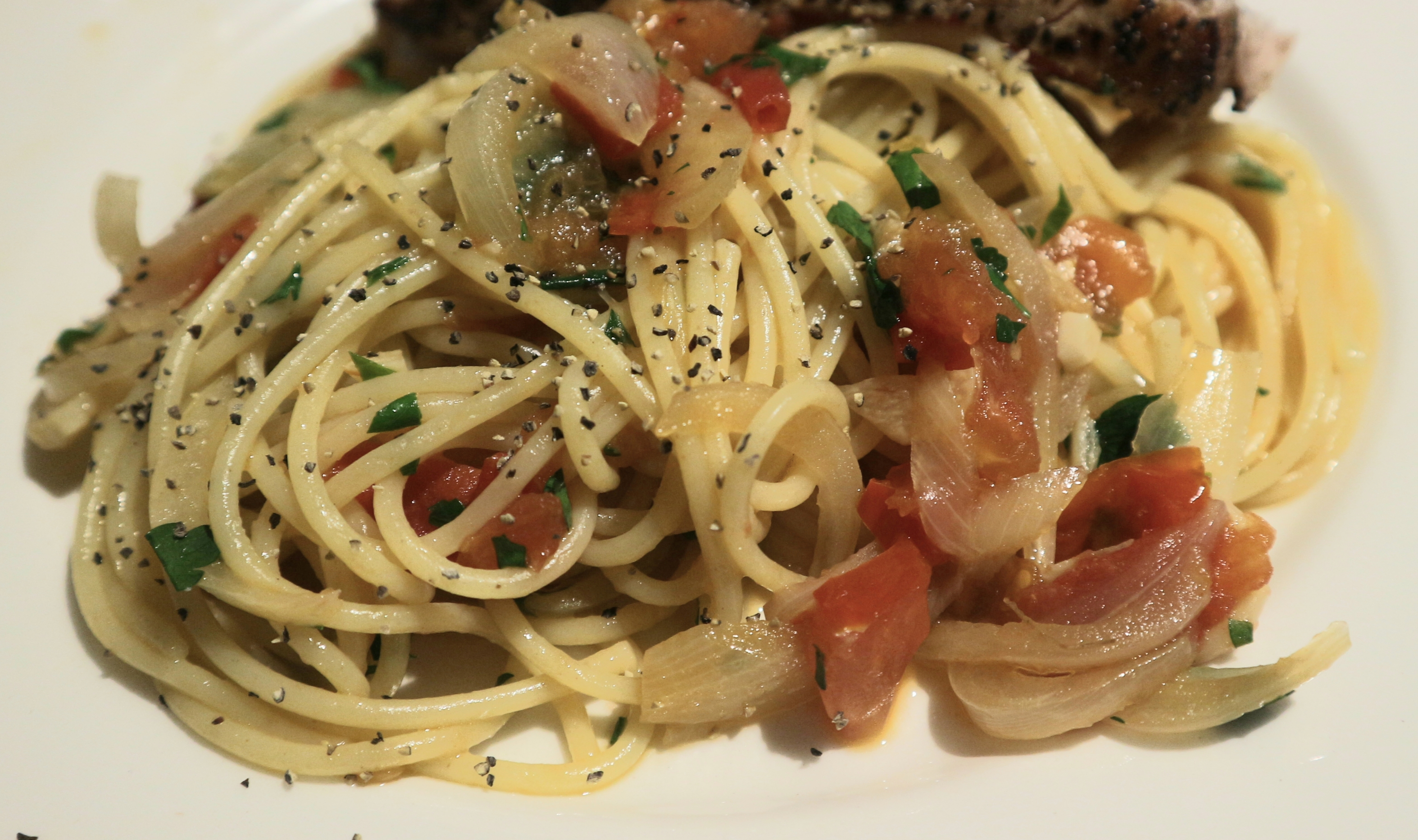 Fisken ble tørket og alle overflatene ble dekket med grov pepper og litt salt. Resten av marinaden ble tilsatt løkblandingen sammen med 2 spiseskjeer fast smør og alt ble rørt sammen. Pasta ble kokt etter instruksjon på pakken. Rett før den var ferdigkokt, tok jeg vare på en øse av kokevannet. Etter at pastaen hadde rent av seg, helte jeg den tilbake i gryta og tilsatte kokevannet jeg hadde tatt vare på. Da klistrer den seg ikke sammen. Løk-tomatblandingen ble også tilsatt sammen med hakket storbladet persille og alt ble blandet godt.