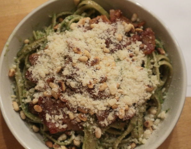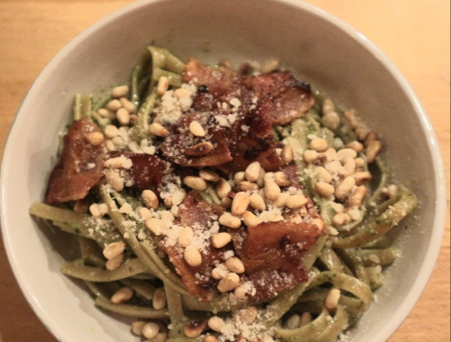 Det smaker utrolig godt med en lett rødvin til denne retten- prøv neste gang du har noen rester bacon og et glass med pesto er alltid lurt å ha hjemme hvis du ikke lager selv og har i fryseren.