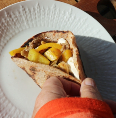 Blandingen plasseres på den ene halvdelen av de flate brødene med litt gresk yoghurt og brødene brettes- litt vanskelig å spise dette pent men du verden så godt