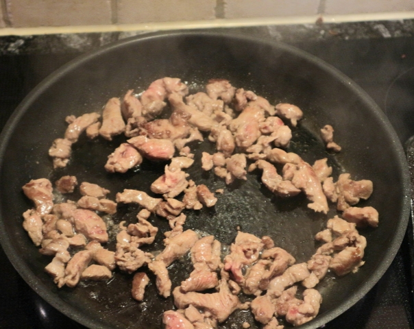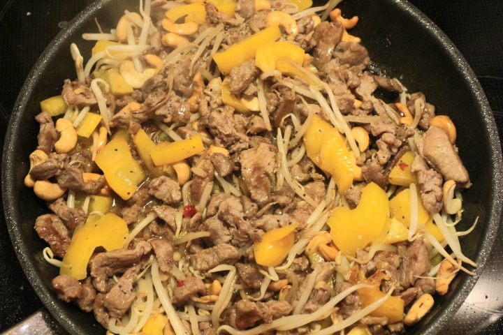 Vårløken og paprikaen ble skåret i strimler og ingefæren ble finhakket. Kjøttet ble stekt i litt rapsolje i en ganske så varm panne til det var brunt. Det ble stekt i 2 omganger og deretter lagt til side. Paprikaen, vårløken og ingefæren ble stekt et par minutter i fettet fra kjøttet og kjøttet ble så lagt tilbake. Buljongen, chilisausen og soyasausen ble blandet. Maisennaen ble rørt ut i blandingen og alt ble helt over kjøtt- og brønnsaksblandingen. Hvis du syntes det blir for tjukt så ha på bitte litt vann.