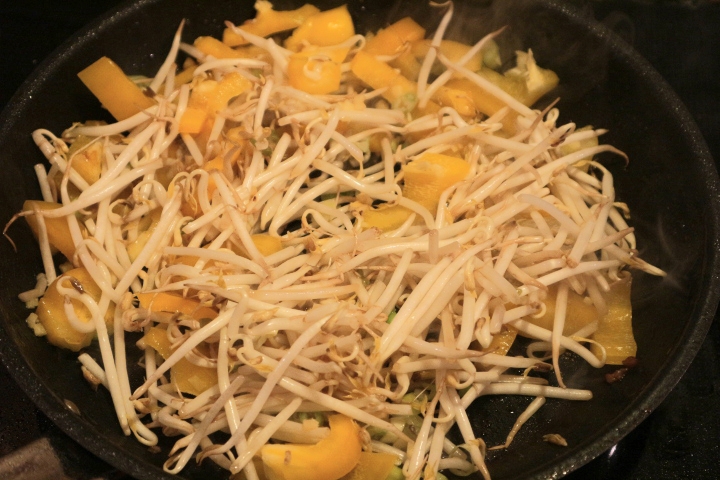 Tilslutt tilsettes bønnespirene og nøttene og alt blandes og smakes til med salt og grov pepper.
