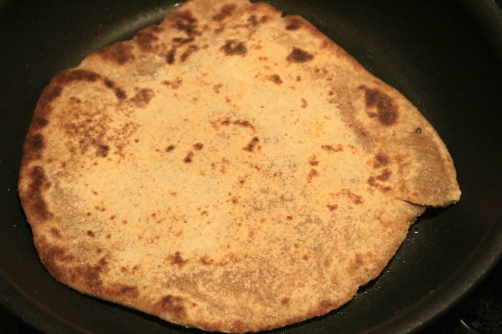 Deretter ble deigen delt i 4 biter som ble kjevlet ut til å passe en liten stekepanne og hvert brød ble stekt i litt olje. Brødene bobler litt opp og da er det på tide å snu dem. De skal ha brune flekker på begge sider. Legg dem oppå hverandre med et tørkehåndkle over så de holder seg myke. Hvis du ønsker brød som er sprøere til å spise ved siden av en rett, deler du deigen i flere biter og kjevler brødene tynnere ut. De vil da bli sprøere og egner seg ikke til wraps osv.