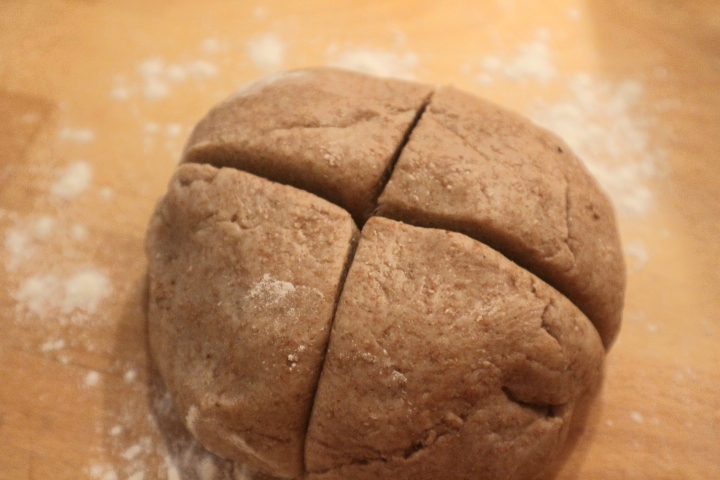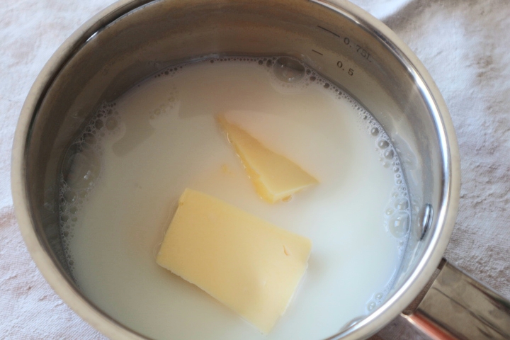 50 gram smør og 1,9 dl melk ble varmet opp til smøret var smeltet. Melet ble tilsatt en bakebolle og melkeblandingen ble tilsatt sammen med en liten teskje salt. Jeg knadde deigen i en kjøkkenmaskin, men disse mengdene lar seg lett blande sammen manuelt i en bolle. Deigen ble pakket inn i plast og fikk hvile i romtemperatur i 30 minutter.