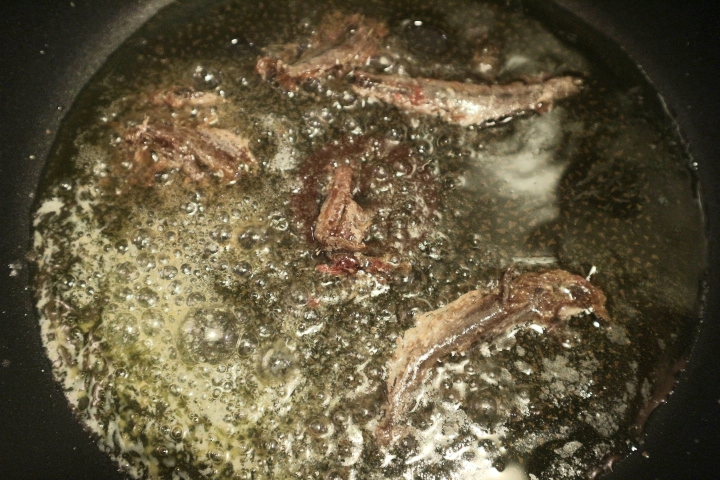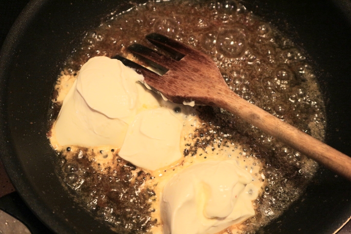 Ansjosen, smøret og oljen has i en varm panne. Rør med en tresleiv til ansjosen har løst seg opp. Tilsett creme fraichen og bland godt slik at det ikke er noen klumper. La sausen koke i ca 10 minutter. Den blir ganske tykk- rør i den av og til. Hell den over i en skål og avkjøl til romtemperatur.