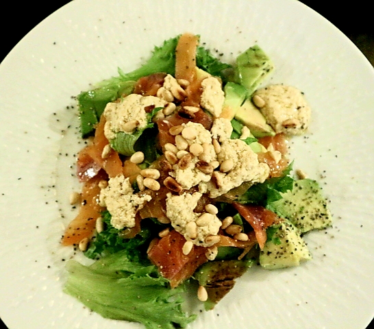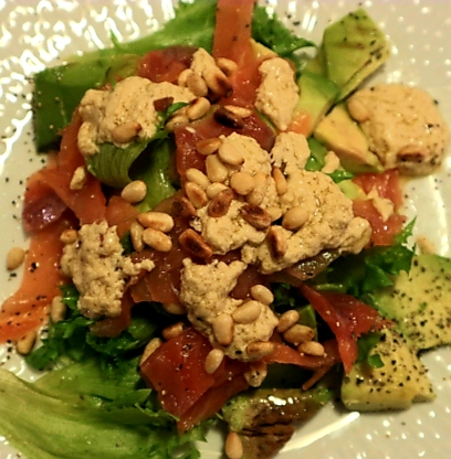 Salaten lages ved å dekke en tallerken med blader av crispy salat, strø over noen strimler røykelaks og biter av avokado i passende mengder til en person. Noen dråper sitronsaft over det hele før du legger på klatter av ansjossausen og avslutter med et dryss ristede pinjekjerner. Hvis du trodde du ikke likte ansjos, så vil du ganske sikkert skifte mening etter å ha smakt denne sausen.