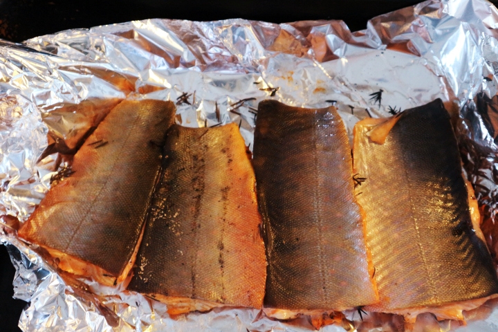 1 fjellørret på ca 1 kilo ble filetert og filétene ble delt i to. Like deler salt og sukker ble blandet (feks 2 spiseskjeer av hver) og blandingen ble drysset over fiskestykkene på kjøttsiden. Fisken ble saltet i 25 minutter og deretter skylt godt og tørket med papir. La deretter filétene med skinnsiden opp på aluminiumsfolie og alt ble lagt på risten oppi røykeovnen som var fyrt opp med bøkeflis og en einerkvist. Fisken ble røkt i 10 minutter. I mellomtiden ble stekeovnen varmet opp til 65 grader og etter røkingen ble filetene overført til en stekeplate med bakepapir med skinnsiden opp og bakt til skinnet lett løsnet. Det tok ikke mange minuttene og har du mindre fisk kan det være den er ferdig etter røkingen.