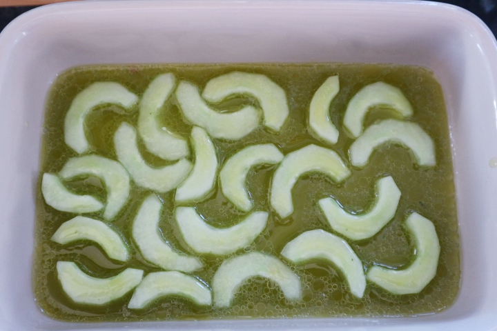 1 agurk ble skrelt, delt i to og frøene ble fjernet. Skrellet og frøene ble kjørt i en blender og silt gjennom en melsikt for å få ut saften (jeg har ingen juicer). Agurken ble skåret i skiver på ca 3 mm’s tykkelse. Agurksaften ble blandet med 2 spiseskjeer friskpresset sitronsaft, 1 dl eplejuice og 2 spiseskjeer olivenolje. Smakte til med salt. Fordelte agurkbitene i et fat og helte over dressingen. Agurken fikk trekke mens fisken ble tilberedt.