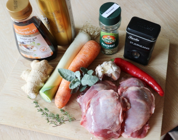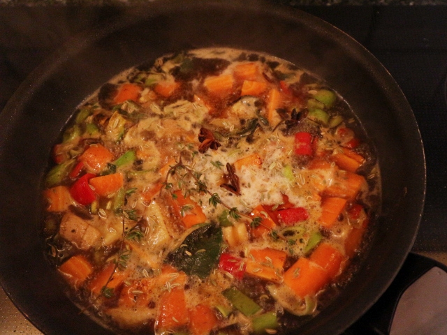 Gulerot, løk, purre, chili og hvitløk ble kuttet i biter og stekt litt på den samme pannen før urtene ble tilsatt. Stekte videre i 2-3 minutter under røring før øl, revet ingefær, fibersukker, fennikelfrø og anis ble tilsatt. Det hele fikk koke i ca 4 minutter før kraften ble tilsatt og alt ble helt over kjøttet i gryten.