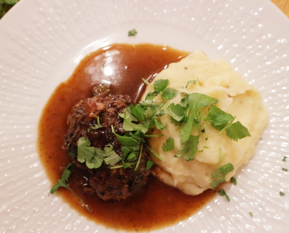 Lokket ble satt på gryten som ble satt inn i ovnen ved 140 grader. Der sto den i 4 timer. Da var kjakene møre. Kraften ble silt gjennom en melsikt og redusert til ca halvparten. Da vil sausen tykne litt. Smak til med salt og grov pepper og pisk inn det kalde smøret- sausen blir enda litt tykkere og blank og rund i smaken. Legg kjakene tilbake i sausen og hold dem varme.