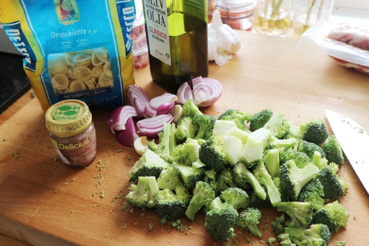 Brokkolien ble delt i små buketter og forvellet i kokende vann i 2 minutter og deretter avkjølt i kaldt vann. Pastaen ble kokt etter anvisning på pakken. Tok vare på litt pastavann, ca 1 kopp.