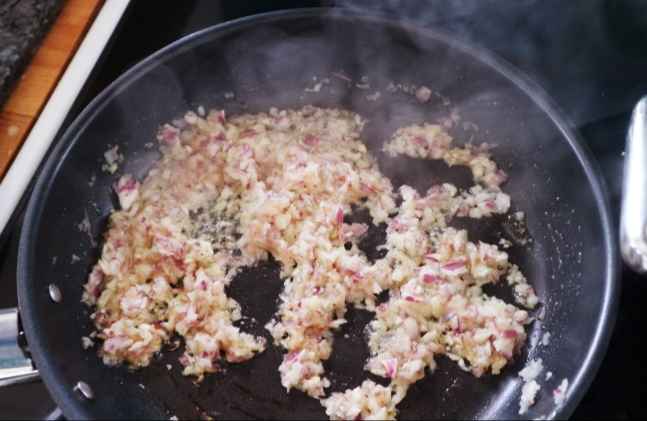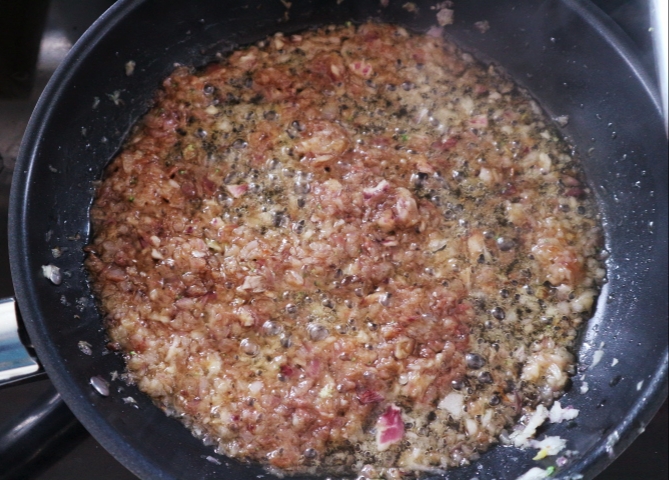 Løken og hvitløken ble hakket fint i en foodprosessor. Litt olje ble varmet i en panne, løkblandingen ble tilsatt og fikk koke ved lav varme til den var myk, ca 8 minutter. Løken skal ikke bli brun. Ansjosfiletene ble så tilsatt og fikk smelte inn i løken under røring.