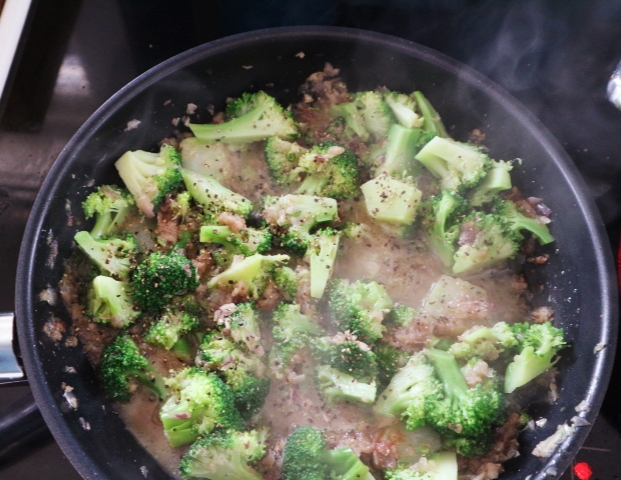 Når sausen var ferdig ble den avkjølte og avrente brokkolien tilsatt sammen med litt grov pepper. DeEt hele ble varmet opp.