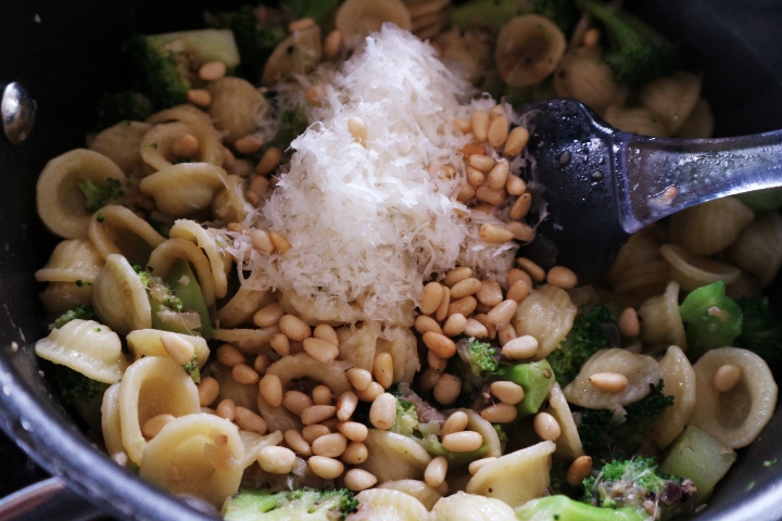 Tilslutt ble pastaen rørt inn sammen med pinjekjerner og revet parmesan. Littav pastavannet ble tilsatt slik at det ble nok saus til å dekke alt.
