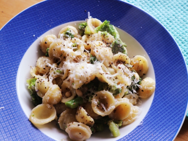 Orecchiette er en pastatype laget av durumhvete og brukes mye i den italienske regionen Puglia. Navnet betyr små ører, men formen ser mer ut som en liten skål med riller under. Den selges i store supermarkeder og får du tak i oricchiette fra De Cecco så anbefales det. De lager pasta av veldig god kvalitet, pastaen blir ikke grøtete og holder seg al dente. Den er også litt ru på overflaten og tiltrekker seg dermed mye mer saus og smak enn glatt pasta. Får du ikke tak i oricchiette så kan du selvsagt bruke en annen pastatype.