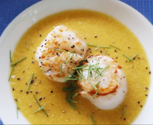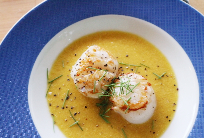 Denne suppen eller juicen fikk vi da vi spiste på Los Guayres i Puerto de Mogan på Gran Canaria i februar. Den ble da servert med en østers og det var en skikkelig smaksopplevelse. Oppskriften fikk vi ikke så dette er et hjemmesnekret forsøk på å få til noe lignende, her med kamskjell.