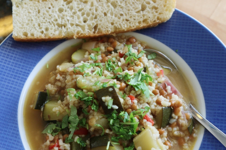 Suppen ble servert med et dryss av fersk koriander og et godt brød. Den smaker av sitron og varme krydder og er kjempegod. Hvis du ikke vil ha den vegetarisk så tilsett gjerne litt kylling eller hønsekjøtt.