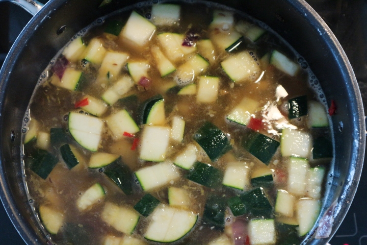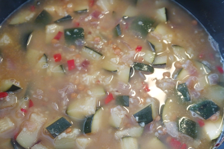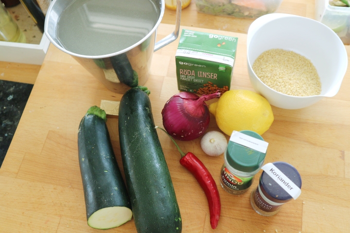 Løken og chilien ble surret i litt olje til løken begynte å bli blank. Drysset over litt flaksalt og tilsatte squash, revet hvitløk og krydder. Det hele fikk surre videre i ca 10 minutter. Tilsatte så revet skall og saften av sitronen, buljongen og linsene (de var skylt i rennende vann) og kokte opp. Suppen fikk koke i 15 minutter.