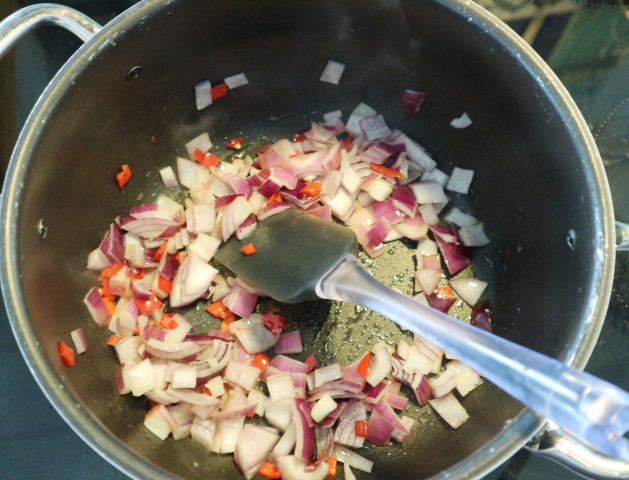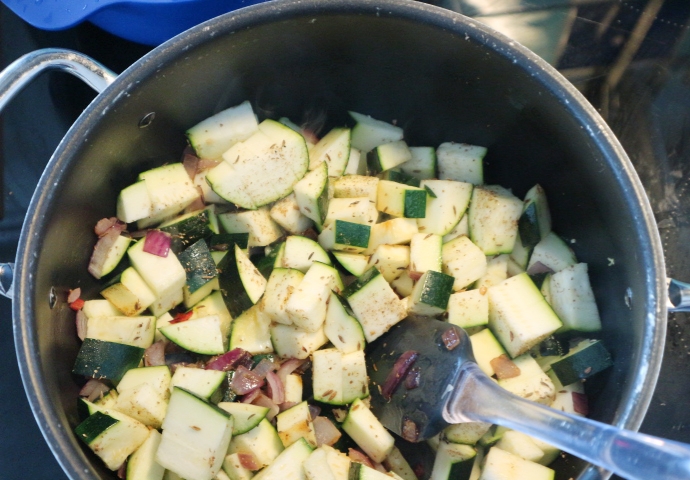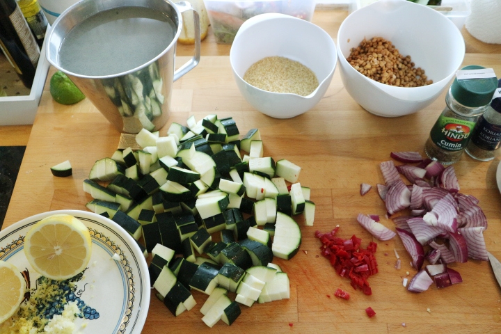 Løken og chilien ble renset og hakket, hvitløken ble revet, sitronskallet ble revet og sitronen presset. Squashen ble skåret i terninger.