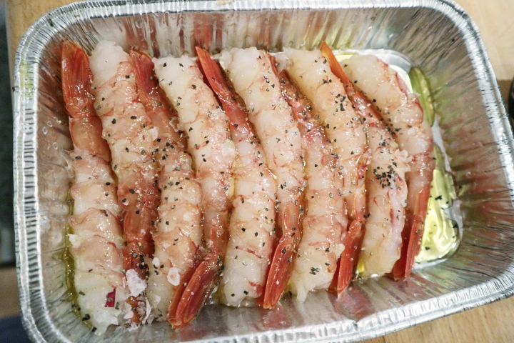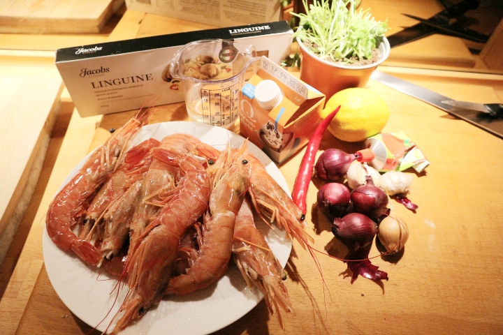 Så var det på tide å koke pastaen etter instruksjon på pakken og sette rekene på grillen. Rekene kan også bakes i stekeovnen ved 200 grader C i 10-12 minutter. Det går litt fortere på en varm grill- ca 7-8 minutter- det er bedre at de varmebehandles litt for lite enn for mye, da blir de seige.