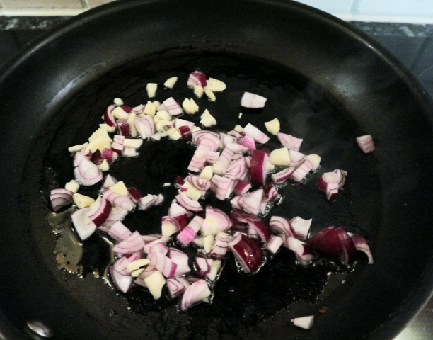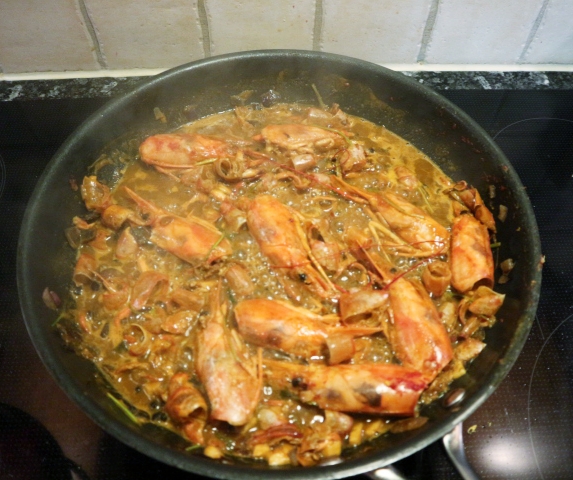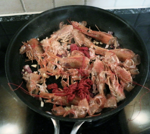 Sausen ble laget ved å steke løken og hvitløken på middels varme til løken ble myk. Tilsatte så rekeskall og tomatpure, rørte rundt slik at puréen ble jevnt fordelt og kokte litt, ca 2 minutter.