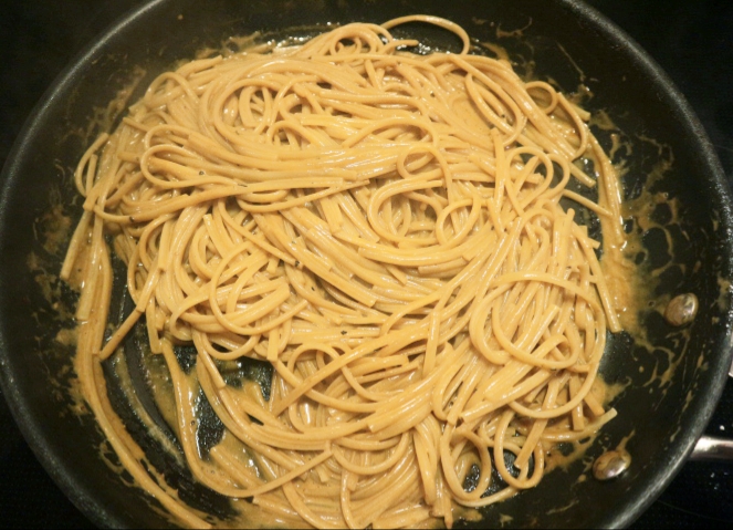 Den ferdigkokte og avrente pastaen ble tilsatt til pannen med sausen og alt ble blandet godt. På grunn av fargen på sausen ser det ikke så pent ut men du verden for noen smaker!!