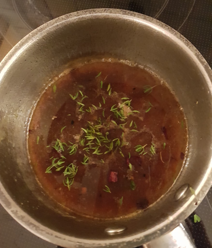 Da grønnsakene var ferdige la jeg dem over på et fat. 1/2 dl grønnsaksbuljong (evt 1/2 dl vann kokt opp med 1 grønnsaksbuljongterning) tilsatt 2-3 spiseskjeer balsamico eddik og noen hakkede blader timian ble kokt opp og tilsatt formen grønnsakene var bakt i. Alt ble helt over i en gryte og væsken ble redusert til den ble seig og sirupsaktig.