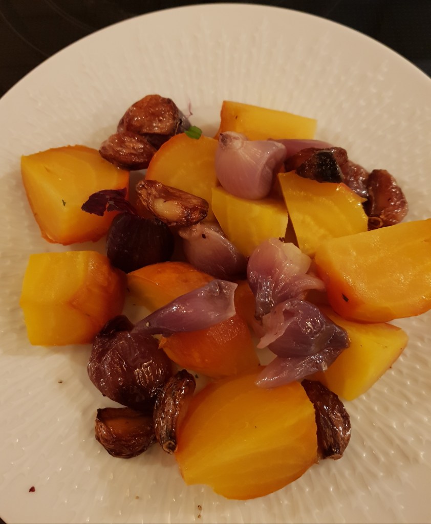 Nå er tiden for ferske beter. Rødbeter er godt, men gulbeter er etter min mening enda bedre. Den er mildere og kanskje litt søtere enn sin røde søster og den mangler jordsmaken som ferske rødbeter ofte har. Her har de fått følge av helstekte små rødløk og hvitløksbåter og dryppet med en balsamicoglasur før servering. Retten passer godt til stekt fisk og stekt lyst kjøtt. Den kan også serveres som en egen rett.