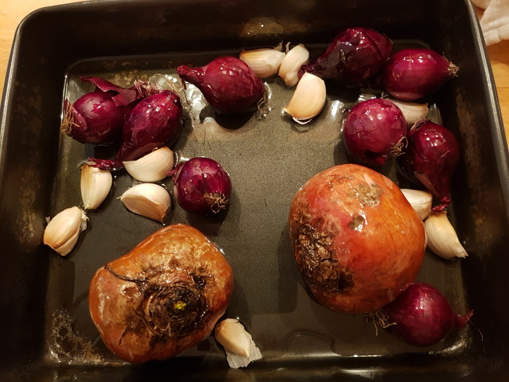 Som tilbehør til 4 personer plasserte jeg to store gulbeter (bruk flere om de er små), endel små rødløk og fedd fra en hel hvitløk, alt med skall på, i et ovnsfast fat og dekket alle grønnsakene med olje. Du kan selvsagt bruke vanlig rødløk også.