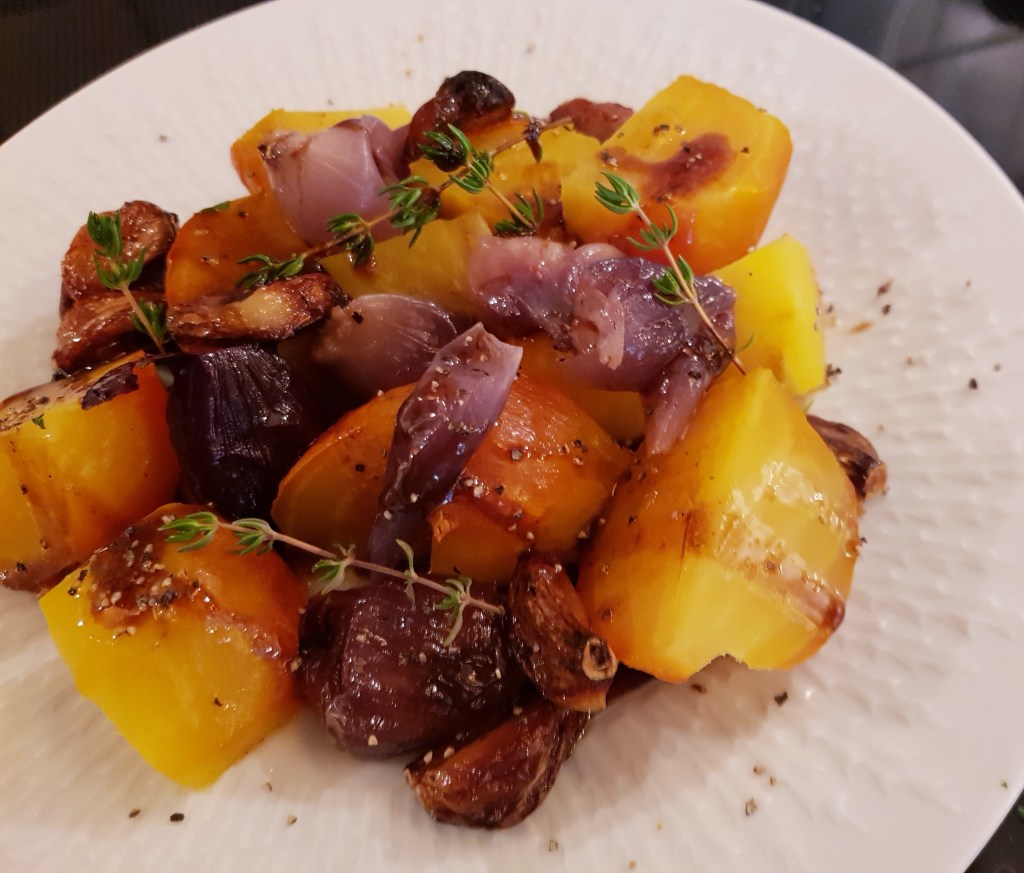 Grønnsakene ble bakt i ovnen ved 180 grader C i ca 1 time og 20 minutter. Tiden avhenger av størrelsen på betene. Stikk i dem med en spiss kniv. Den skal komme inn mot midten men det gjør ingenting om den møter litt motstand.