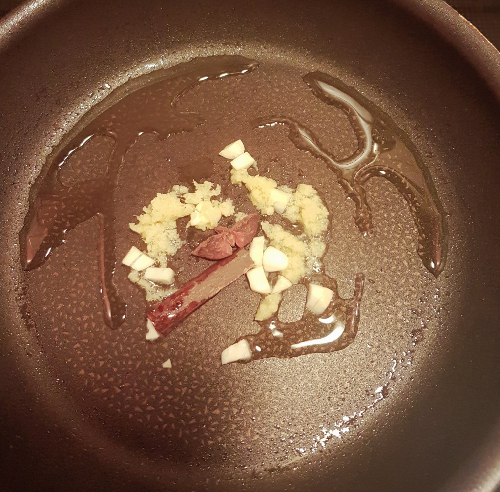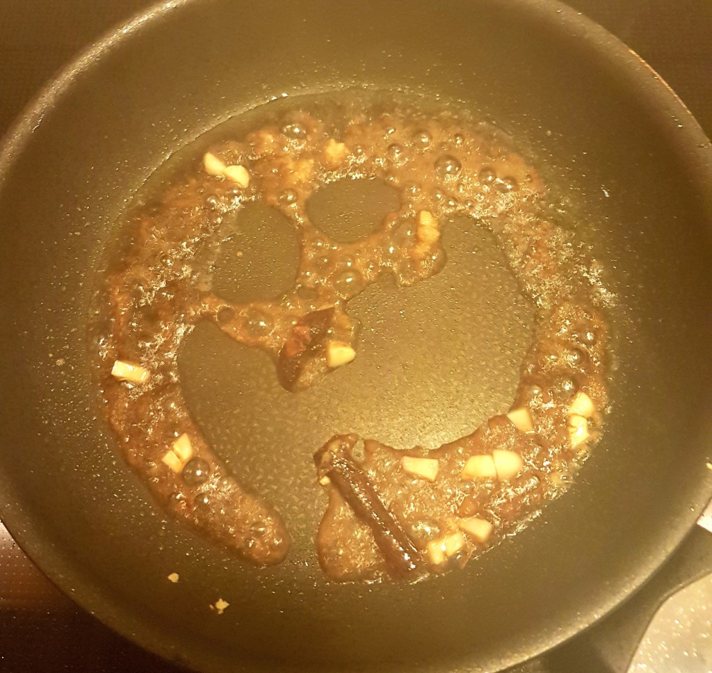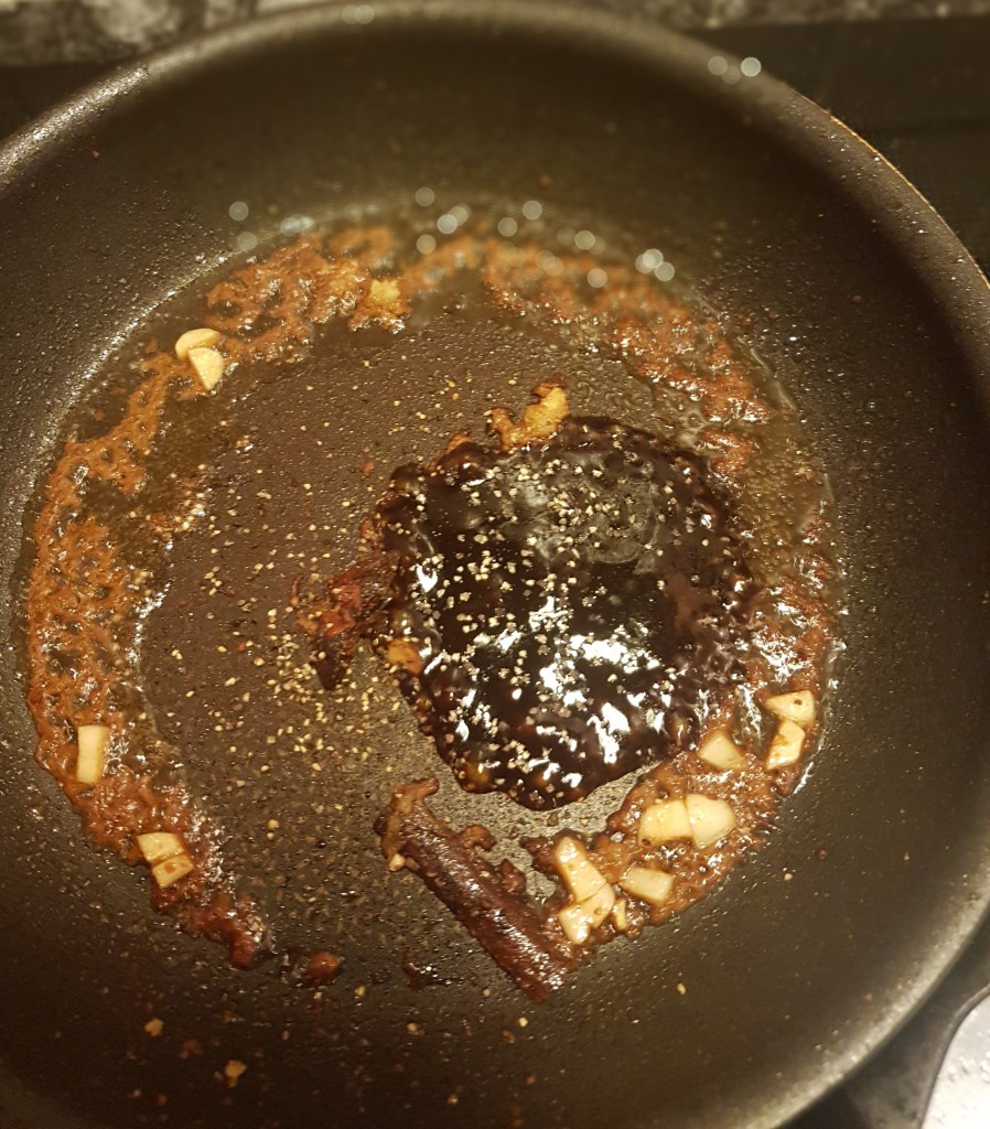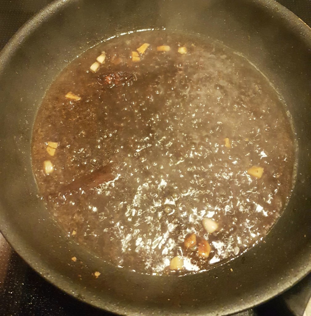 Varm litt olje i en panne. Stek hvitløken, den revne ingefæren, kanelstangen og stjerneanisen i ca 1 minutt mens du rører. Tilsett lys og mørk soyasaus og kok i ca 1 minutt før du rører inn en klype grov pepper og østersausen.