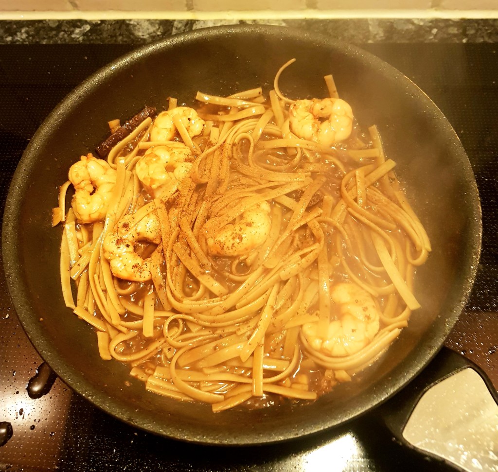 Sausen er nå ferdig. Hvis du vil servere den med pasta/nudler og stekte reker koker du pastaen/nudlene etter instruksjonen på pakken. Jeg bruker rå ville argentiske reker fra fryseren som er tint og koker dem raskt i den varme sausen, snu dem etter ca 1 minutt.