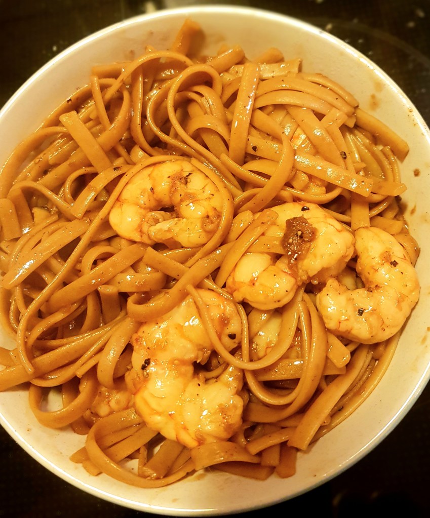 Denne pastasausen er noe helt for seg selv. Den tar utgangspunkt i en oppskrift publisert av Nigella Lawson og kombinerer asiatiske smaker med våre kjente julekrydder. Det er en unik kombinasjon og en utrolig smaksopplevelse. Hvem skulle tro at store reker og julekrydder passer sammen? Sausen krever endel ingredienser, men hvis du er glad i å lage mat så er jeg sikker på at du har de fleste allerede. Har du ikke ketjap manis kan du blande like deler mørk soyasuas med brunt sukker.