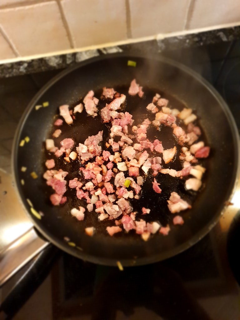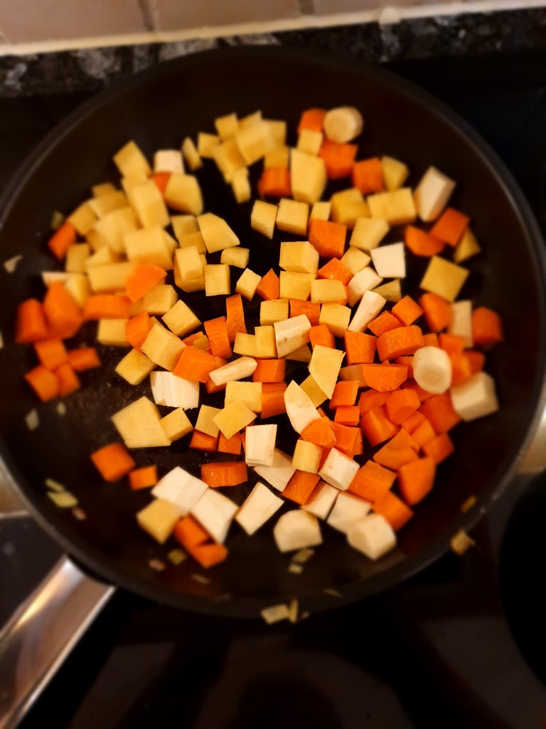 Grønnsakene stekes porsjonsvis i olje og has over i en gryte. Stek løk, hvitløk og purre først på middels varme til løken blir blank. Rør hele tiden så hvitløken ikke blir brun. Stek deretter rotgrønnsakene på litt høyere varme til de begynner å få litt farge. Tilslutt brunes baconet og has i gryten sammen med grønnsakene.
