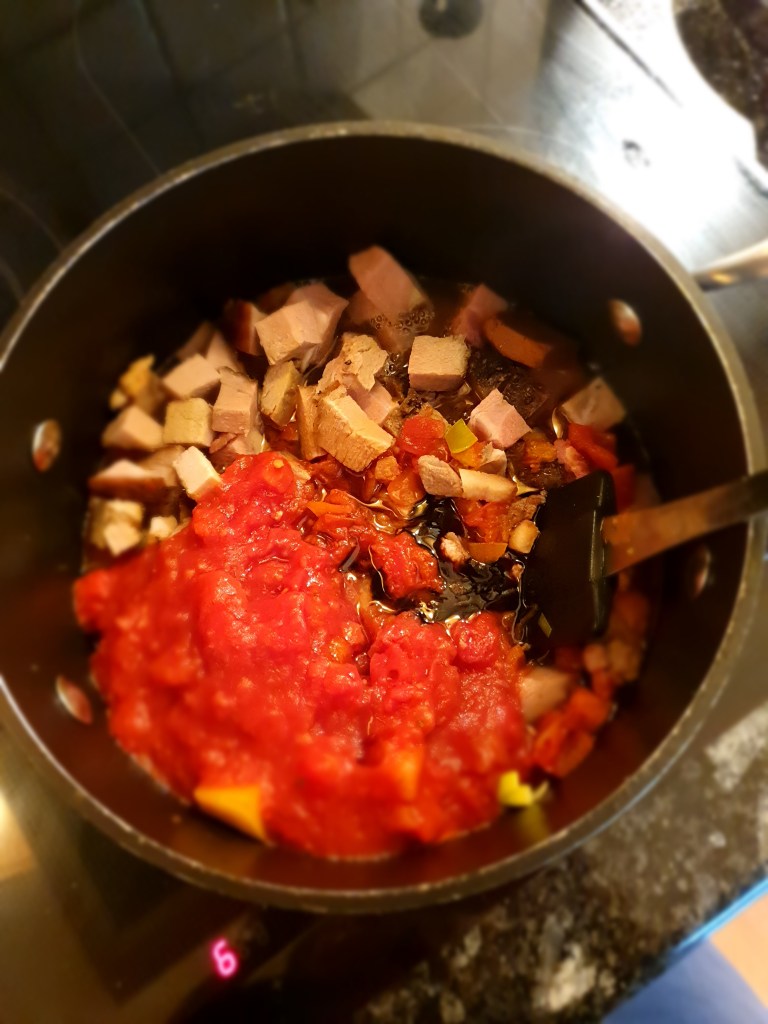 Tilsett de knuste tomatene, buljongen, soya, østerssaus og sesamoljen sammen med kjøttrestene.