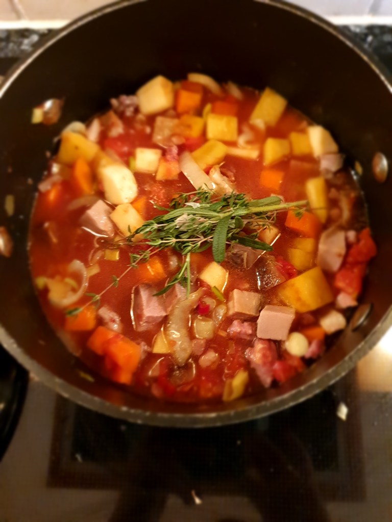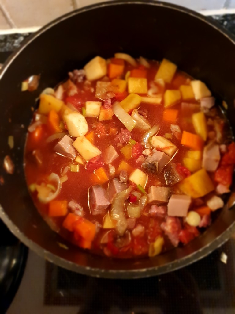 Her i vår husholdning, som til daglig er 2 personer, har vi veldig ofte rester av kjøtt. Det kan være alt fra en filét, et lammelår til en surret stek. Vi har også ofte rester i kjøleskapet av grønnsaker som begynner å bli litt triste. Da er en løsning å lage en gryte. Det er lettvint middag og kan lages ferdig på forhånd og bare varmes opp når det er tid for å spise den. I prinsippet kan du ha oppi det meste. Denne oppskriften tar utgangspunkt i en skalk fra en kalvestek. Kalv har jo ikke så mye smak så jeg har tilsatt litt bacon og litt asiatiske smaker.